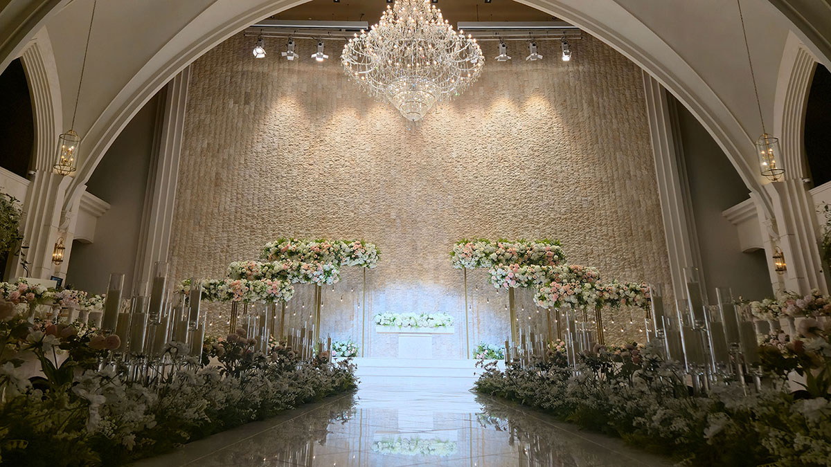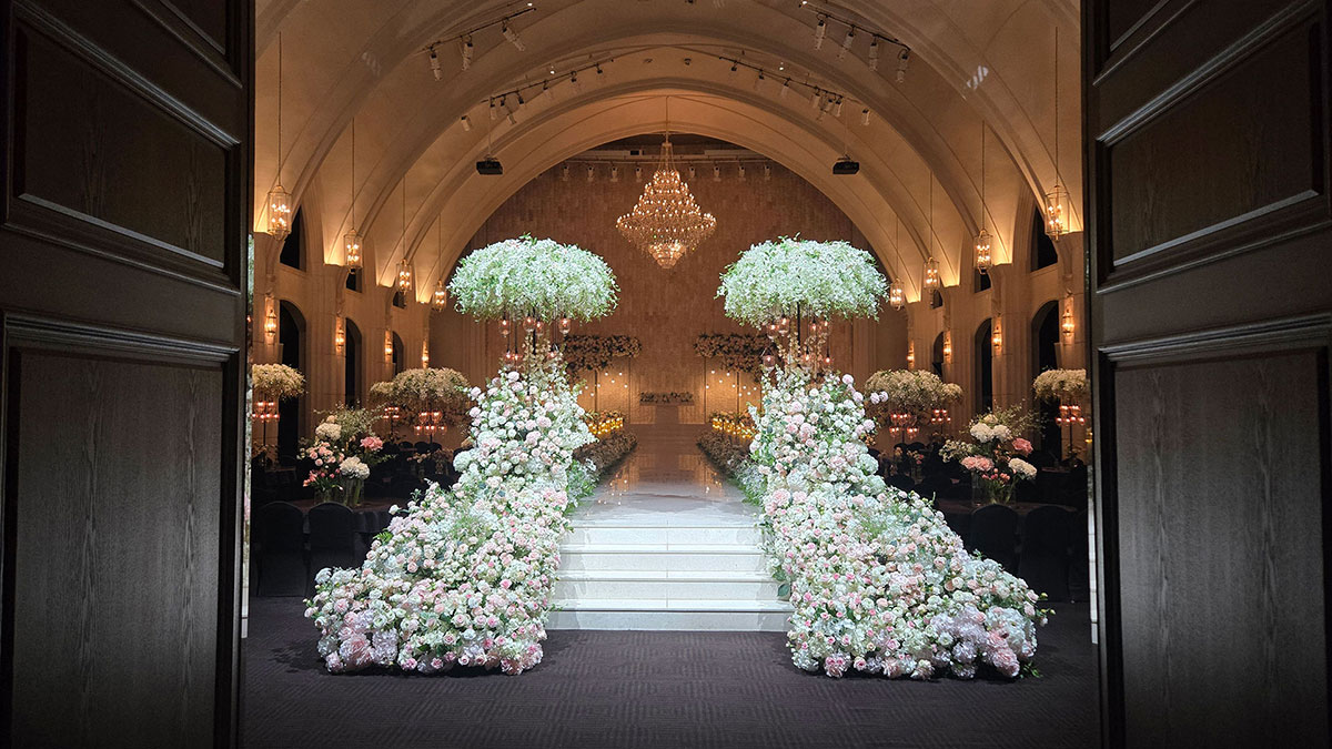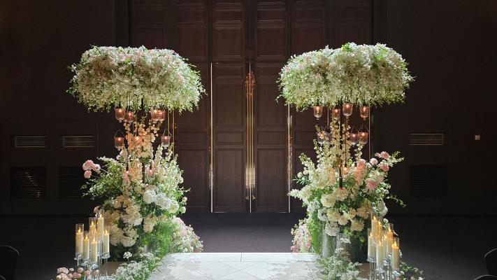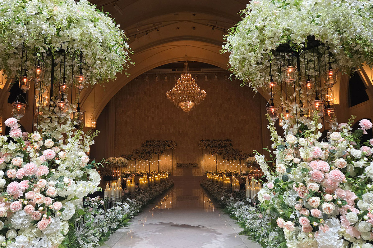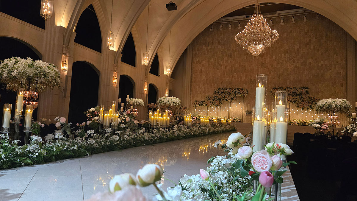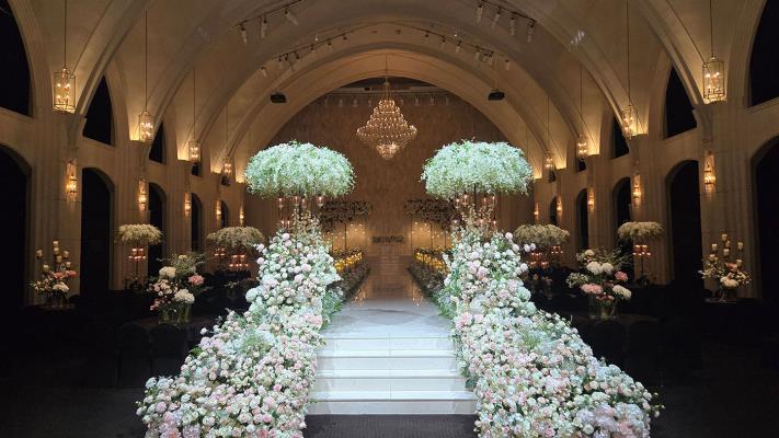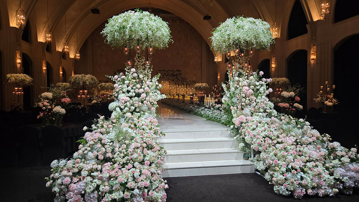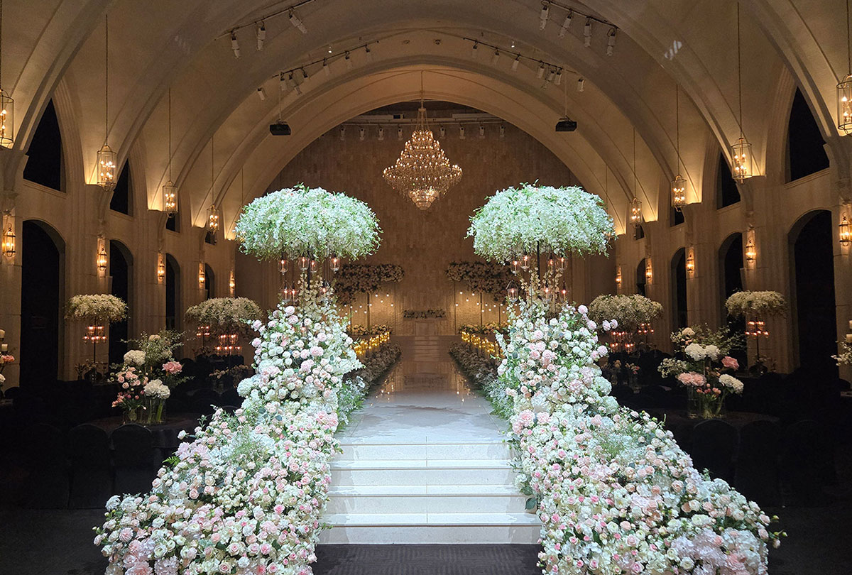높고 긴 버진로드는 풍부한 생화 세팅과