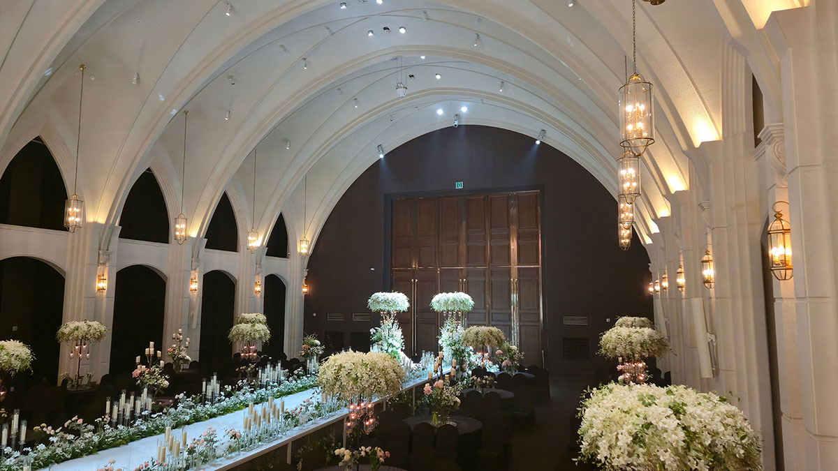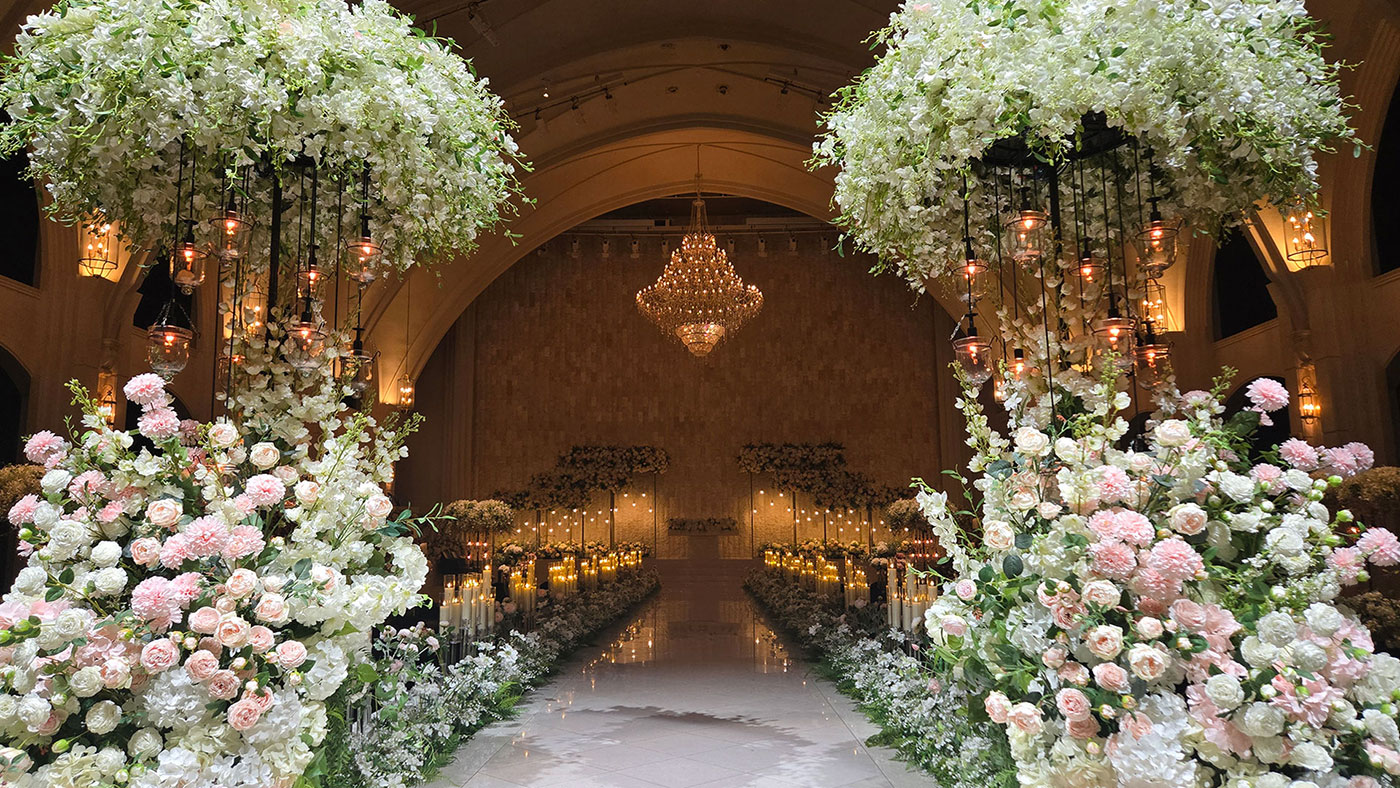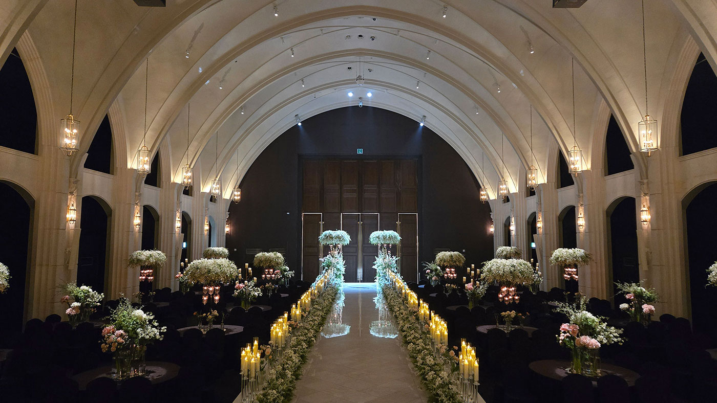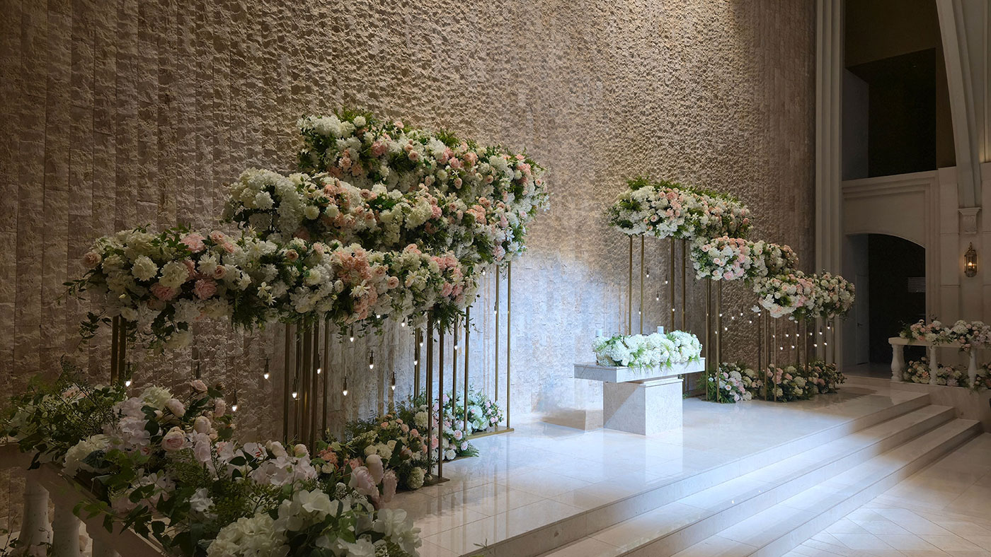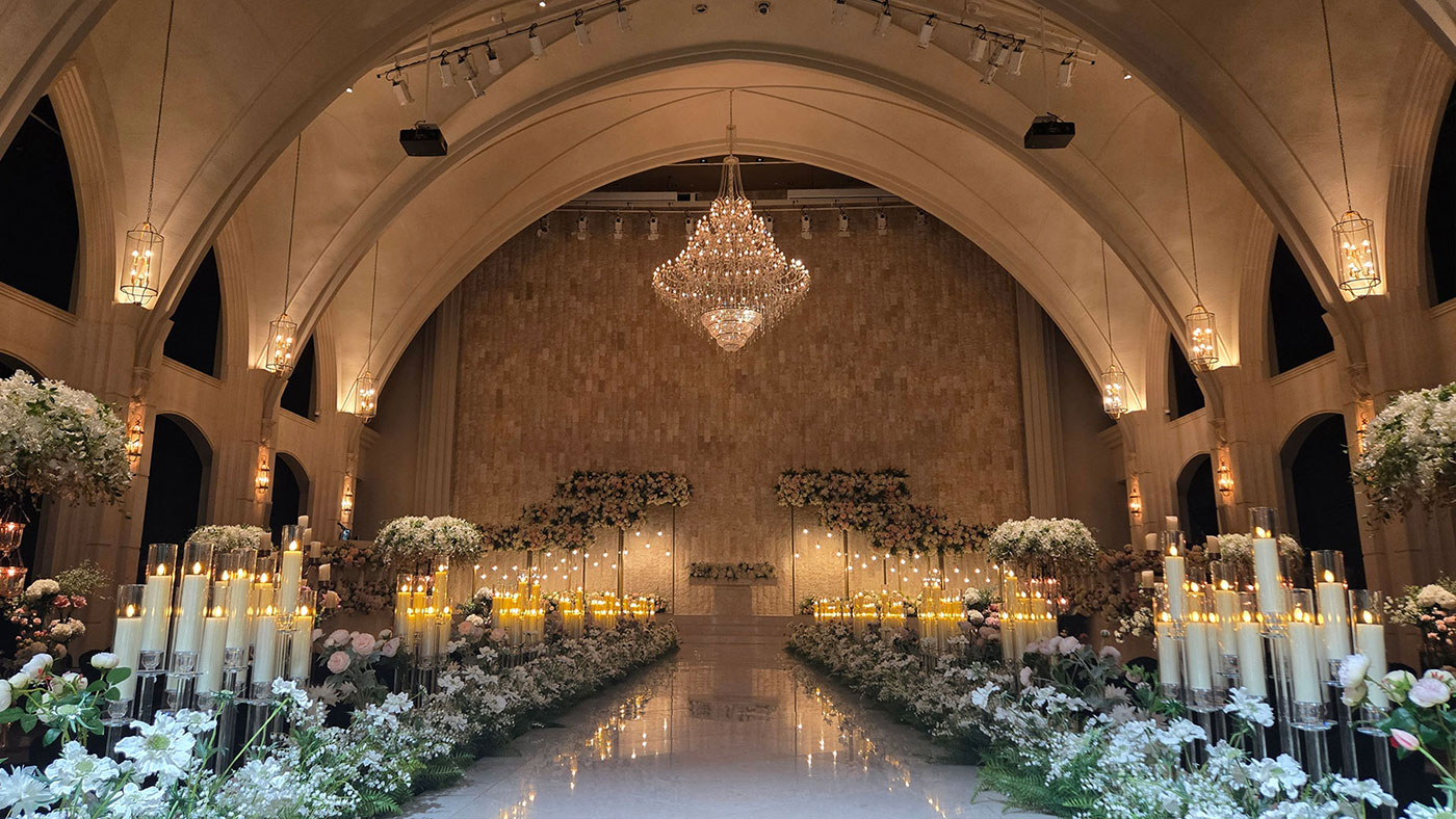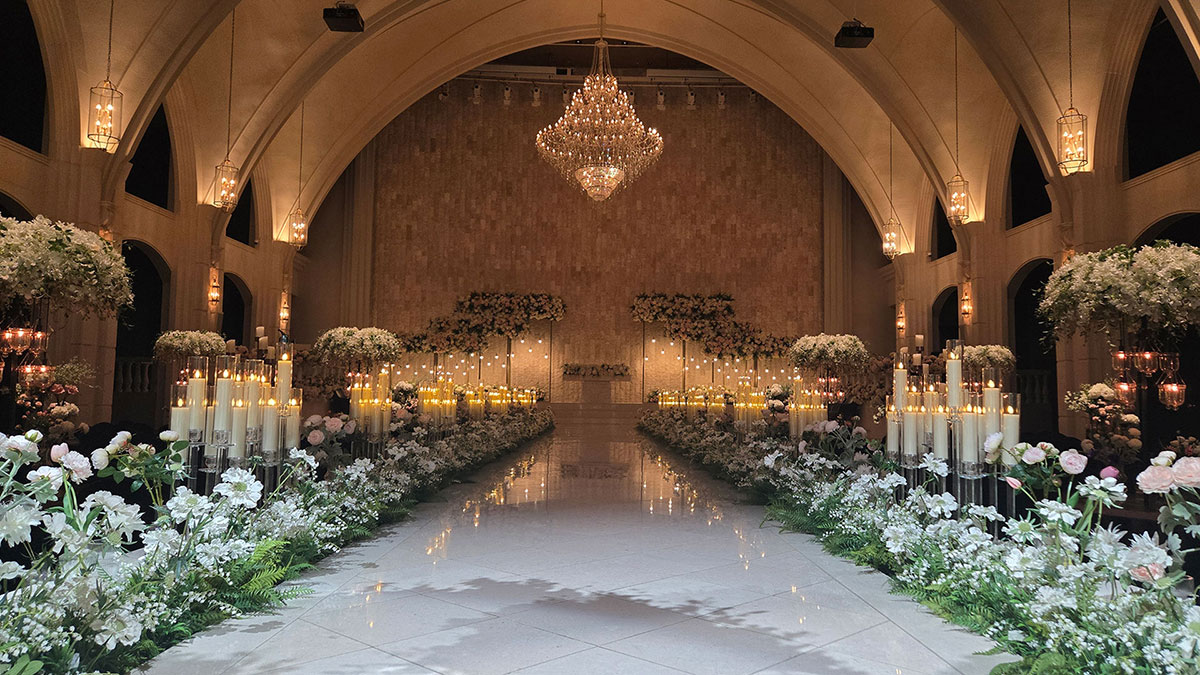 높고 긴 버진로드는 풍부한 생화 세팅과