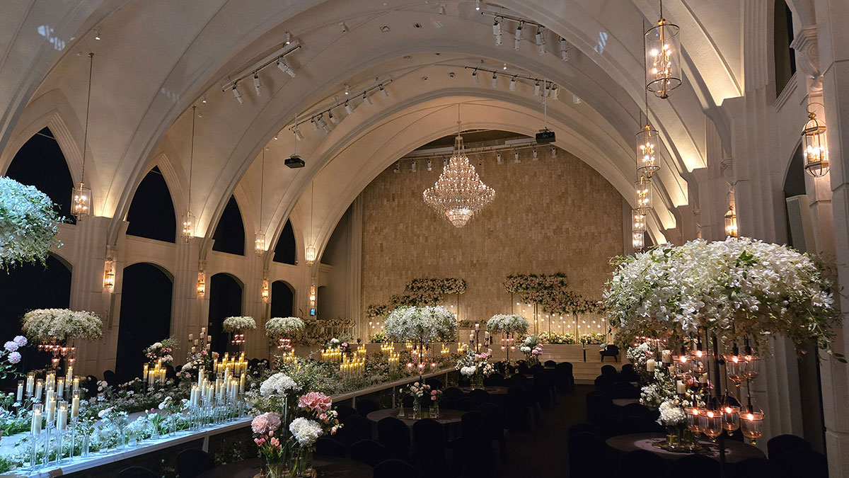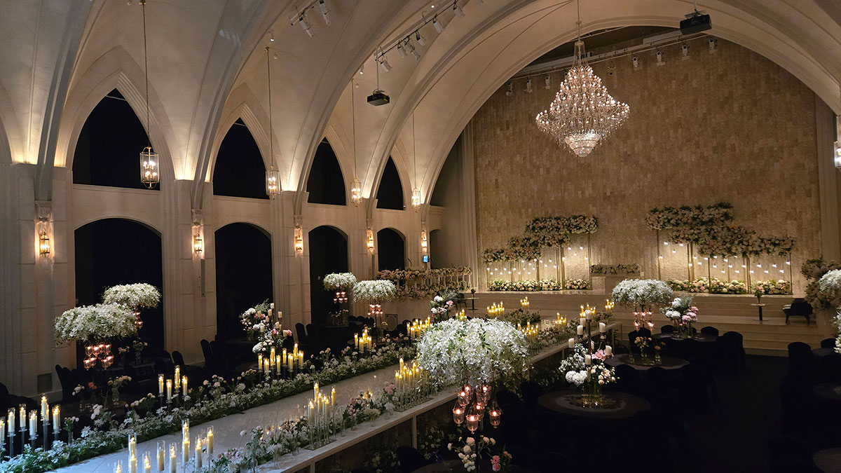 우아한 천장 샹들리에와 단상, 캔들 장식 등이