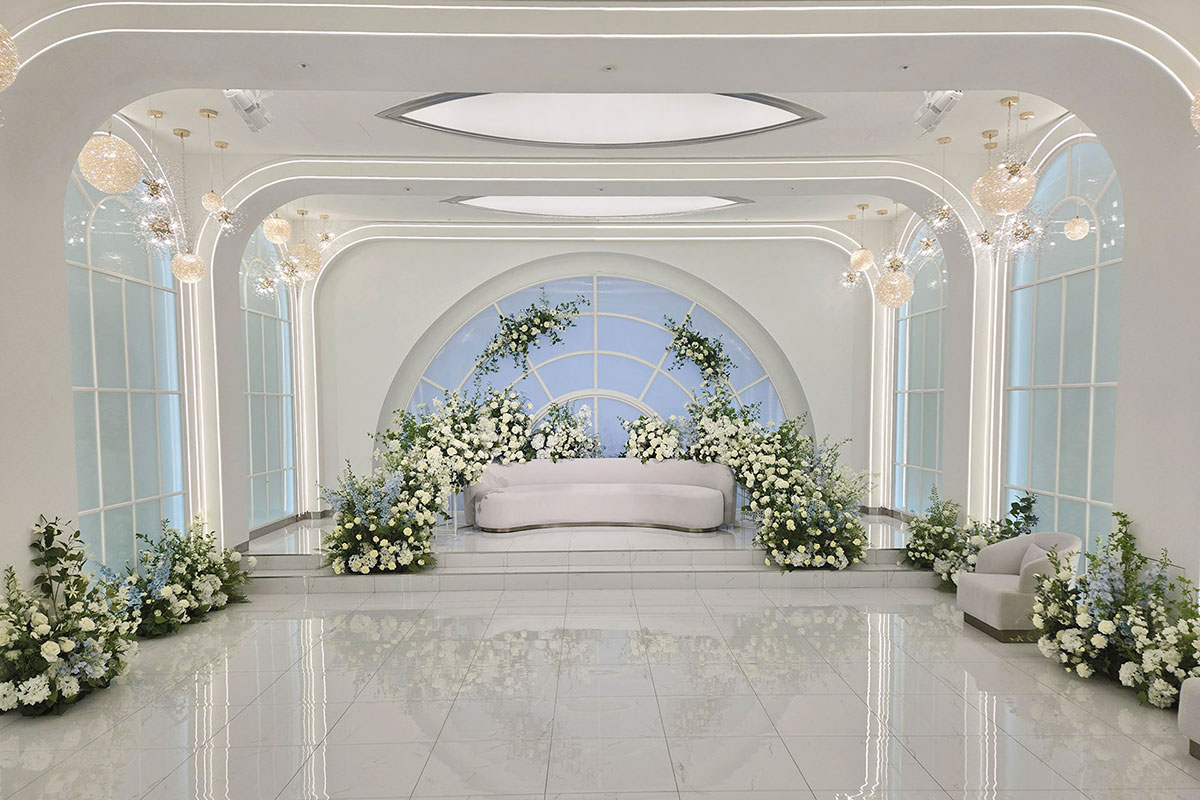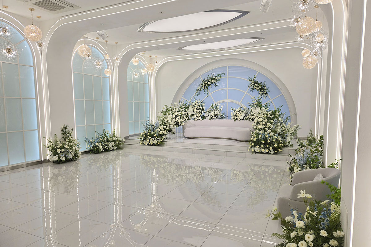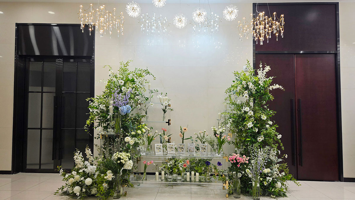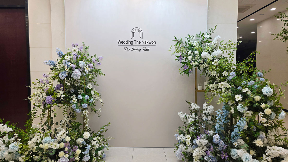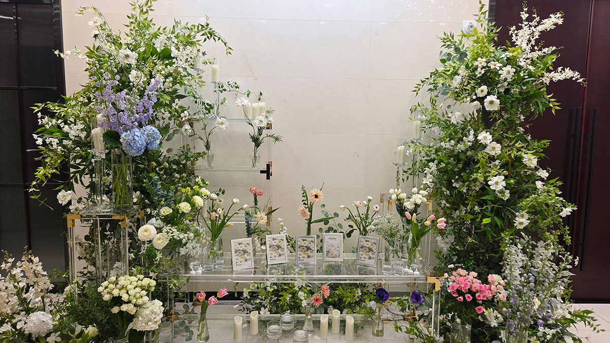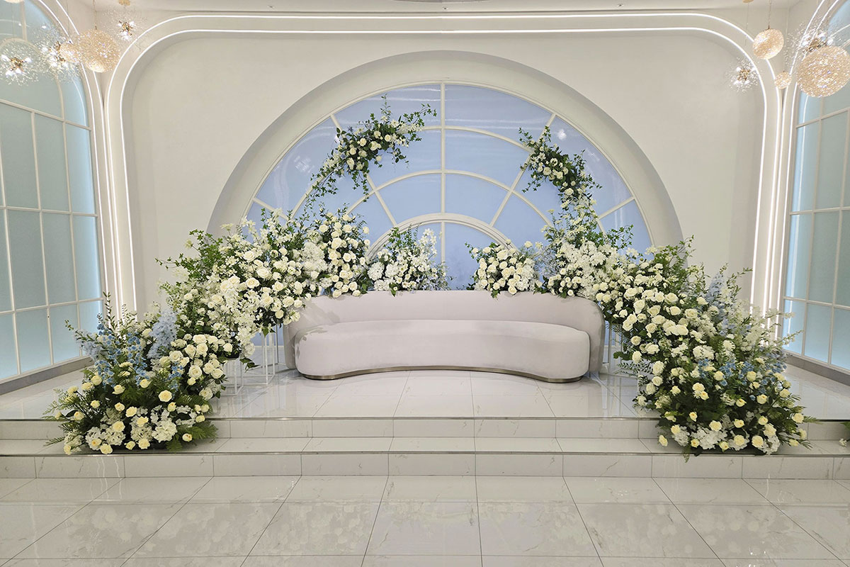 화이트와 블루가 어우러진 풍성한 생화 연출은