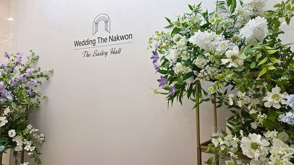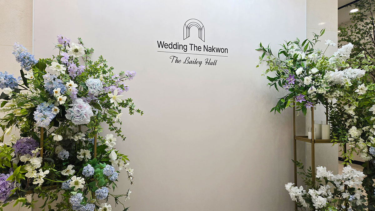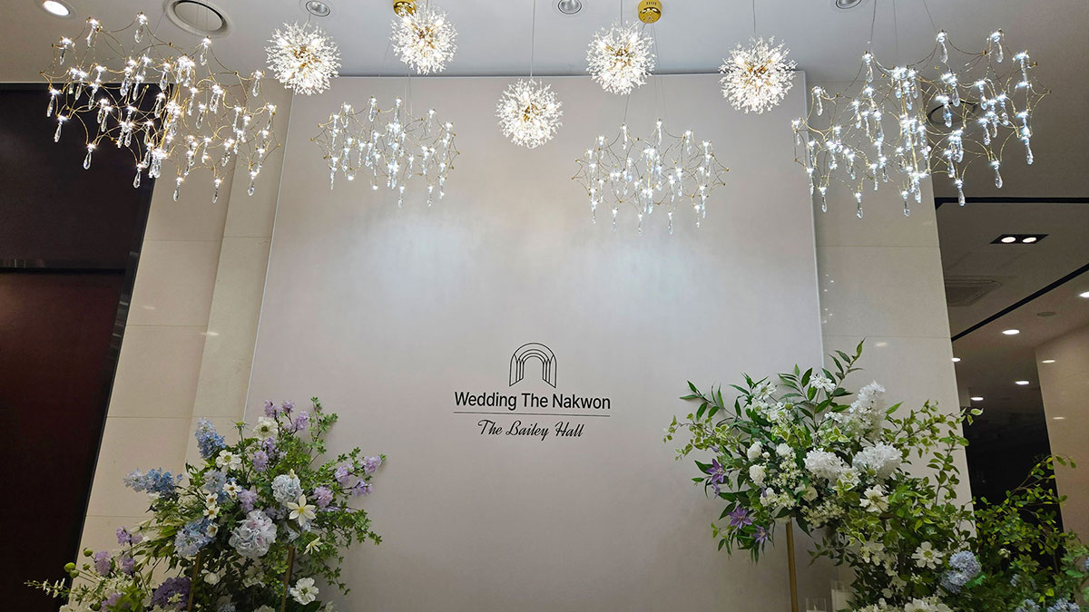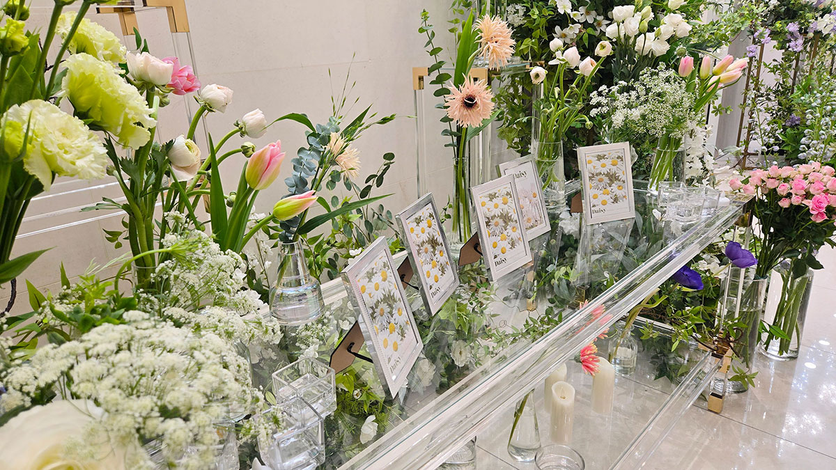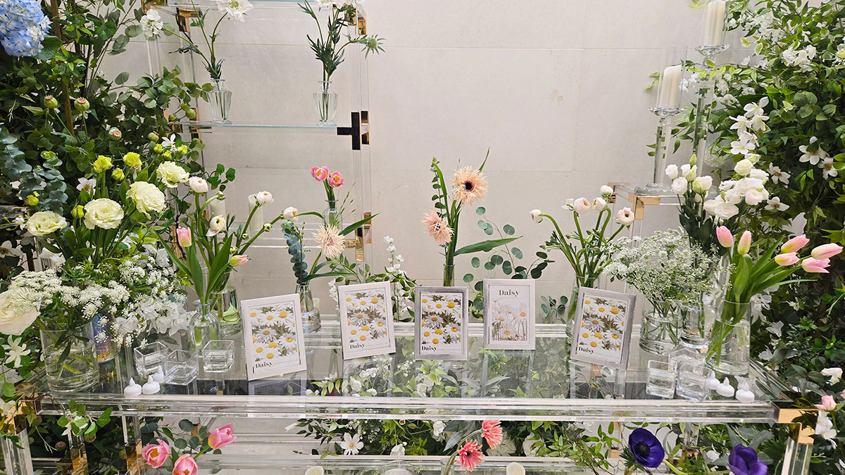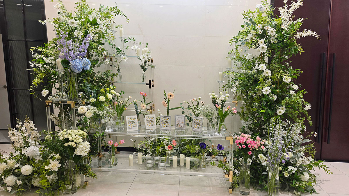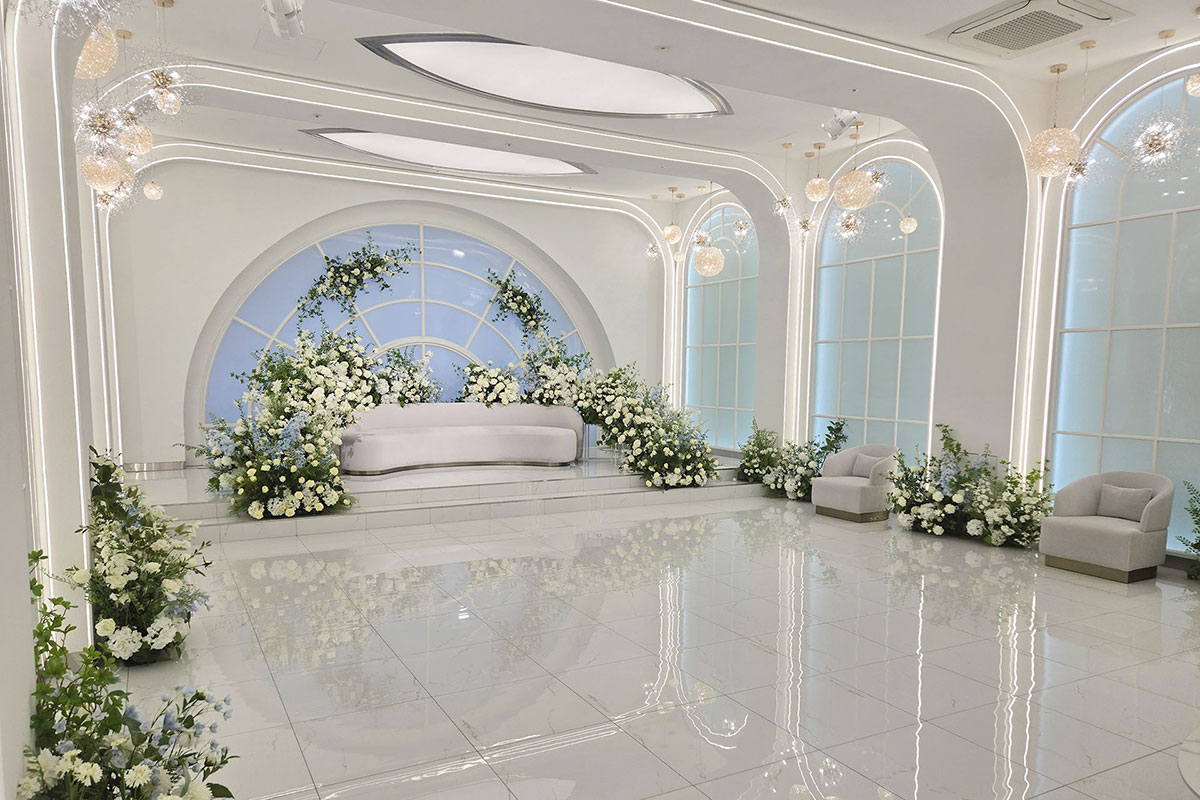화이트와 블루가 어우러진 풍성한 생화 연출은
